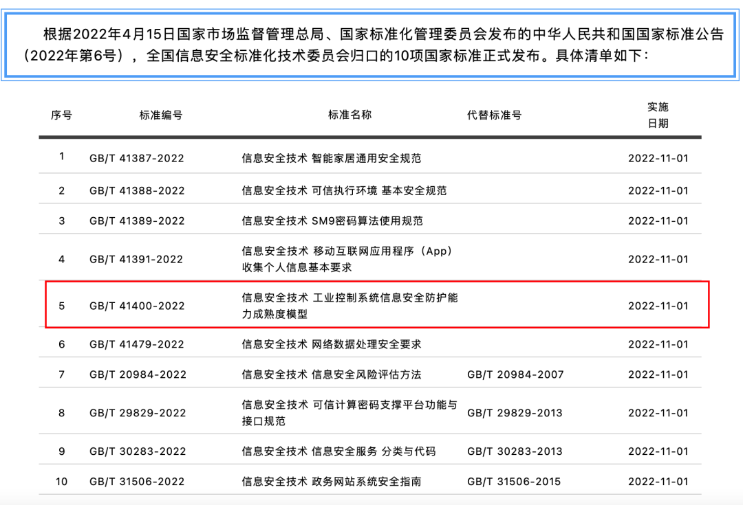 4月24日,全国信息安全标准化技术委员会发布10项国家标准。安恒信息深度参与了《GB/T 41400-2022 信息安全技术 工业控制系统信息安全防护能力成熟度模型》的编制工作,并基于信息安全防护能力成熟度模型的五大指标,提出三大能力建设,助力工业企业整体工控安全能力有效落地。