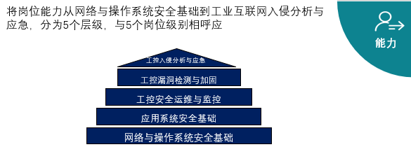 ▲将岗位能力从网络与操作系统安全基础到工业互联网入侵分析与应急,分为5个层级;