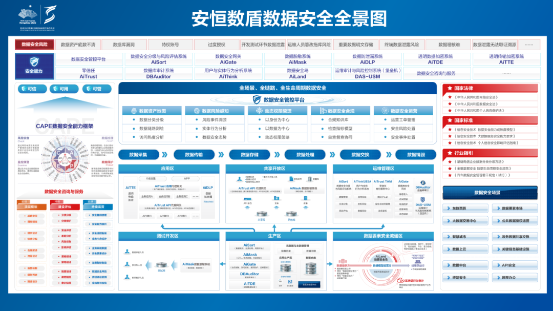 数据安全的目的,不是把数据锁牢,而是让业务放心大胆地使用数据,创造更大的商业和社会价值。为此,安恒信息诞生了“一切为数据安全而生,一切为运营数据安全而服务”的体系——安恒数盾数据安全解决⽅案,聚焦于咨询规划、身份安全、数据保护、数据流通4个⽅向,提供⾯向全场景、全链路、全⽣命周期的数据安全解决⽅案。同时将数据安全能⼒框架CAPE和数据安全咨询服务结合,实现可信、可⽤、可管、可溯源的数据安全防护体系。目前,安恒数盾数据安全解决方案为政府、公安、金融、运营商、医疗等多个行业实现落地。