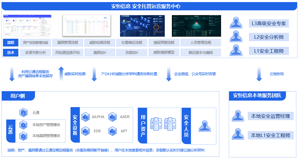 7*24小时在线的云端三级安全运营专家以及分布在全国各城市的本地服务团队,通过云端托管运营服务平台实现用户侧安恒边界、流量、终端设备的托管,并按照资产发现、暴露面检测、互联网漏洞扫描与管理、威胁实时检测响应等运营流开展工作。