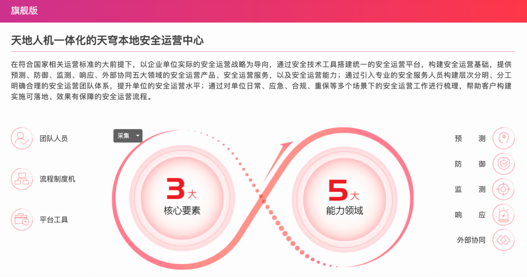 在符合国家相关运营标准的大前提下,以企业单位实际的安全运营战略为导向,通过安全技术工具搭建统一的安全运营平台,构建安全运营基础,提供预测、防御、监测、响应、外部协同五大领域的安全运营产品、安全运营服务,以及安全运营能力;通过引入专业的安全服务人员构建层次分明、分工明确合理的安全运营团队体系,提升单位的安全运营水平;通过对单位日常、应急、合规、重保等多个场景下的安全运营工作进行梳理,帮助用户构建实施可落地、效果有保障的安全运营流程。