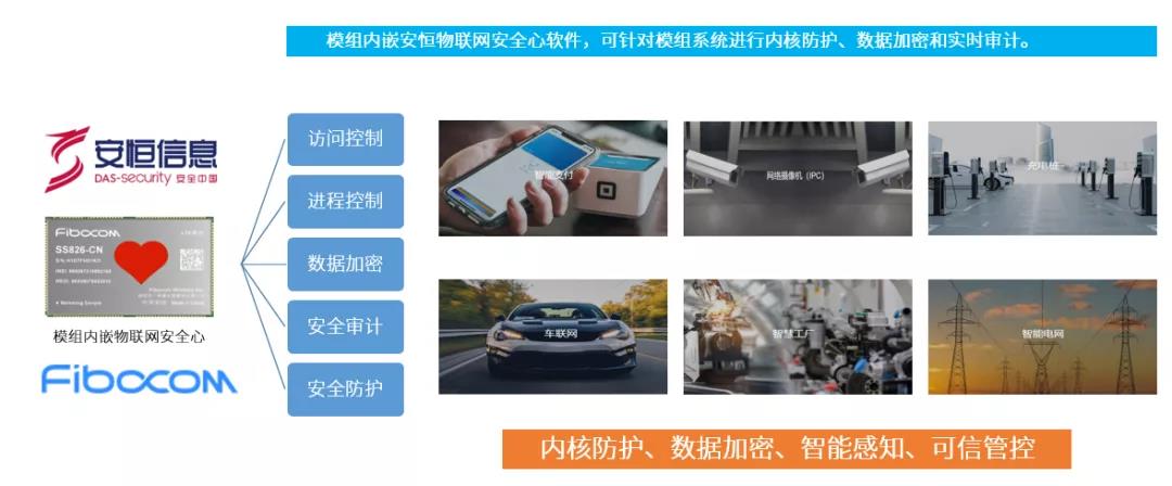 搭载安恒物联网安全心软件平台的广和通智能模组SS826,为物联网终端设计提供全程端到端数据加密,国密标准算法,密文传输,密文存储。