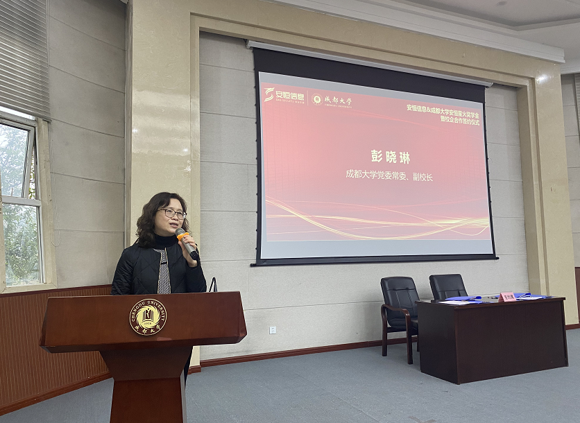 成都大学党委常委、副校长彭晓琳发表致辞。她表示,成都大学在安恒信息的大力支持下,共同发起设立“安恒星火奖学金”为进一步深化校企合作创造了有利契机,翻开了双方在科研、人才培养等诸多方面深入合作的崭新篇章。下一步,希望双方不断加强在教育发展、人才共培、战略方向上的合作,实现互惠共赢。