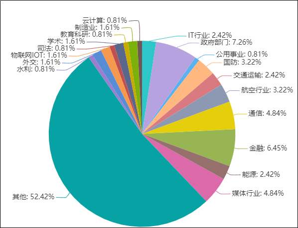 10月多数行业均遭到不同程度的恶意威胁,按照攻击行业,分布如下,其中政府部门、金融、国防、航空、媒体行业收录内容占比较高。
