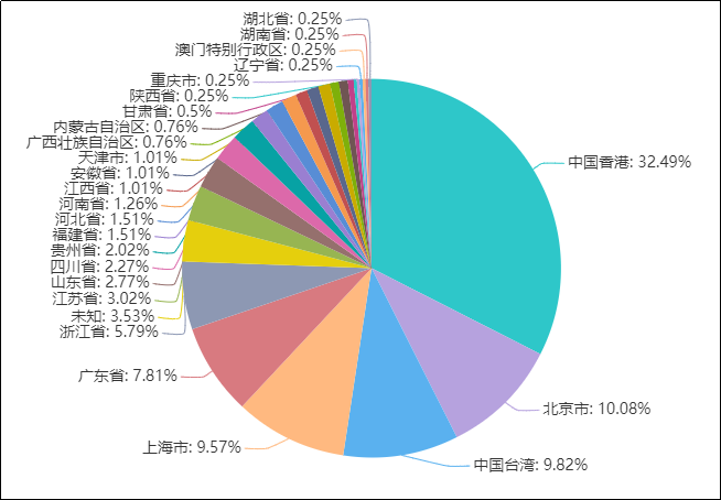 以中国的省市分布来看,IP恶意情报分布排名前5的分别为中国香港、北京、中国台湾、上海、广东,其中中国香港的恶意IP占比最高,为32.49%。
