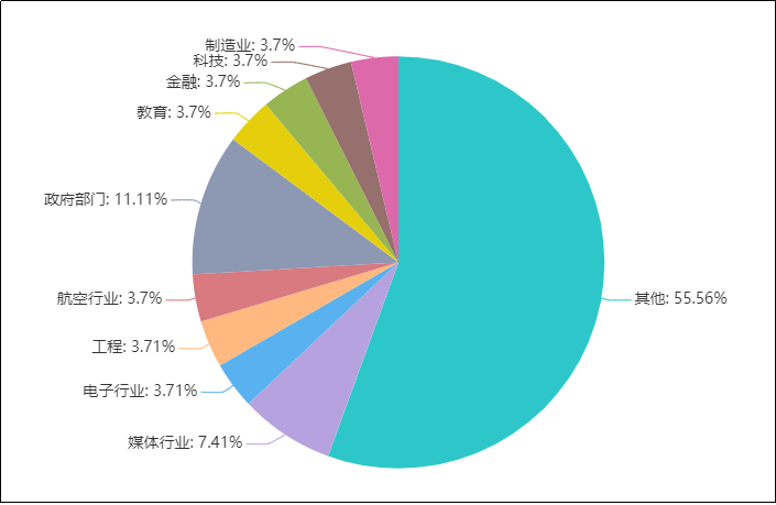 勒索软件攻击的行业涉及媒体、教育、制造业、金融、政府、航空等。10月的攻击中,政府部门和行业媒体的占比较高,分布占比11.11%和7.41%。