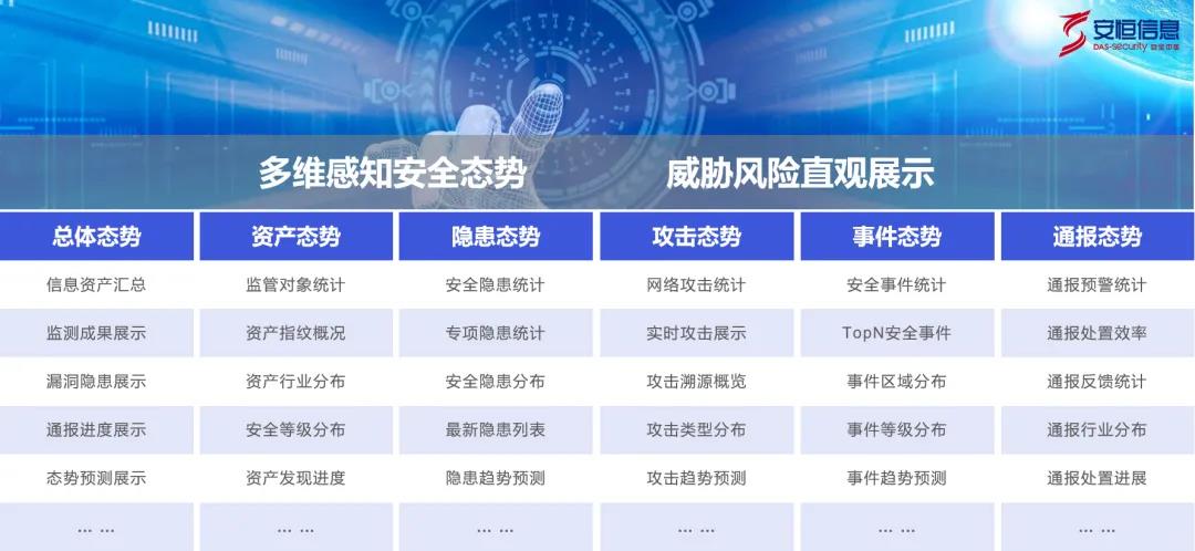 安恒信息态势感知平台无论是在多源异构数据采集、海量数据存储、安全事件溯源分析等核心技术方面,还是在安全态势可视化展示、多场景业务监管等实际应用方面都具备先发优势。能力表现为以下几点: