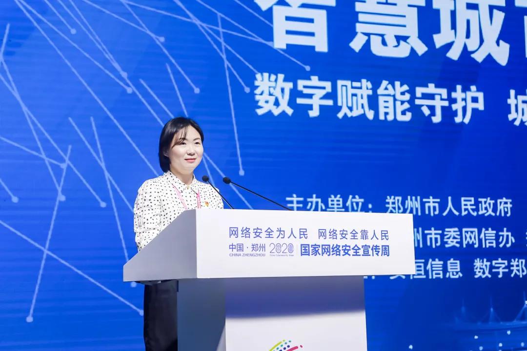 河南省大数据管理局副局长赵璐发表讲话,她提到,在智慧城市建设方面,安全是智慧城市可持续发展的基石,发展是不断检验安全的实践。