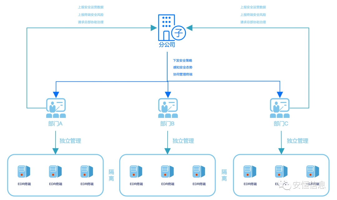 人生就是搏z6尊龙调研发现,随着企事业单位的发展壮大,集团跨区域管理、精细化管理已成为常态,终端资产安全运维管理尤为重要。为了提高终端资产管理效率以及适应安全能力的要求,许多企业集团客户在运营终端安全的时候,终端全局管控和精细化管控要两手抓。但是目前行业内的终端管理方案要么是做不到集团总部全局管控,要么就是无法做到分公司独立的精细化管理。基于以上的背景,安恒信息认为企业集团客户需要更灵活更全面的资产管理方案,安恒EDR终端多级管理体系便应运而生。