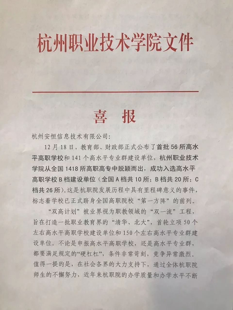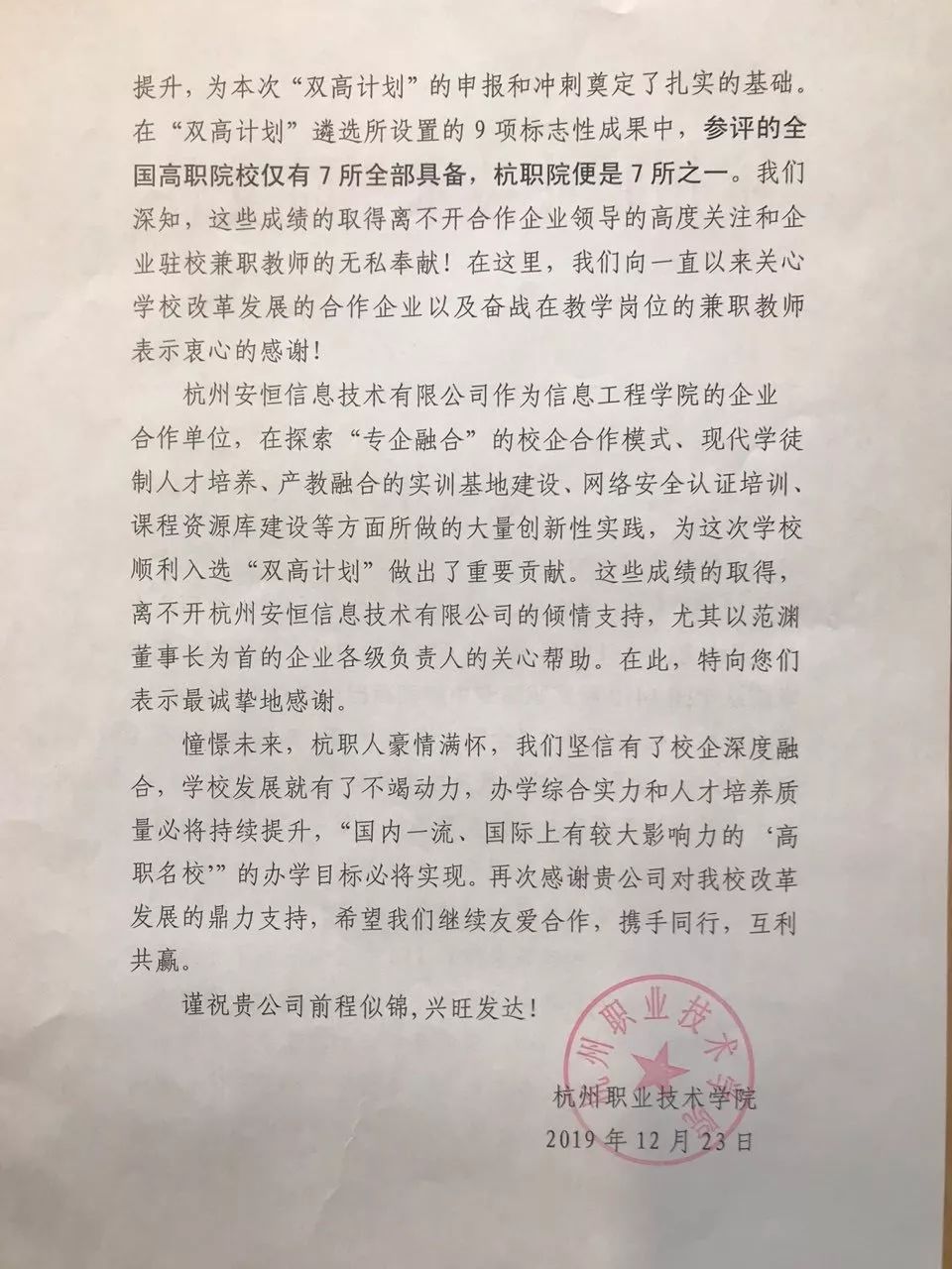 作为安恒信息产学研合作院校,杭州职业技术学院入选了首批高水平高职学校B档建设单位,正式跻身全国高职院校“第一方阵”的前列。自2015年安恒信息和杭州职业技术学院达成合作关系后,双方致力共同探索“专企融合”的校企合作模式、现代学徒制人才培养、产教融合的实训基地建设、网络安全认证培训、课程资源库建设等方面所做出的大量创新性实践,助力杭州职业技术学院顺利入选“双高计划”。