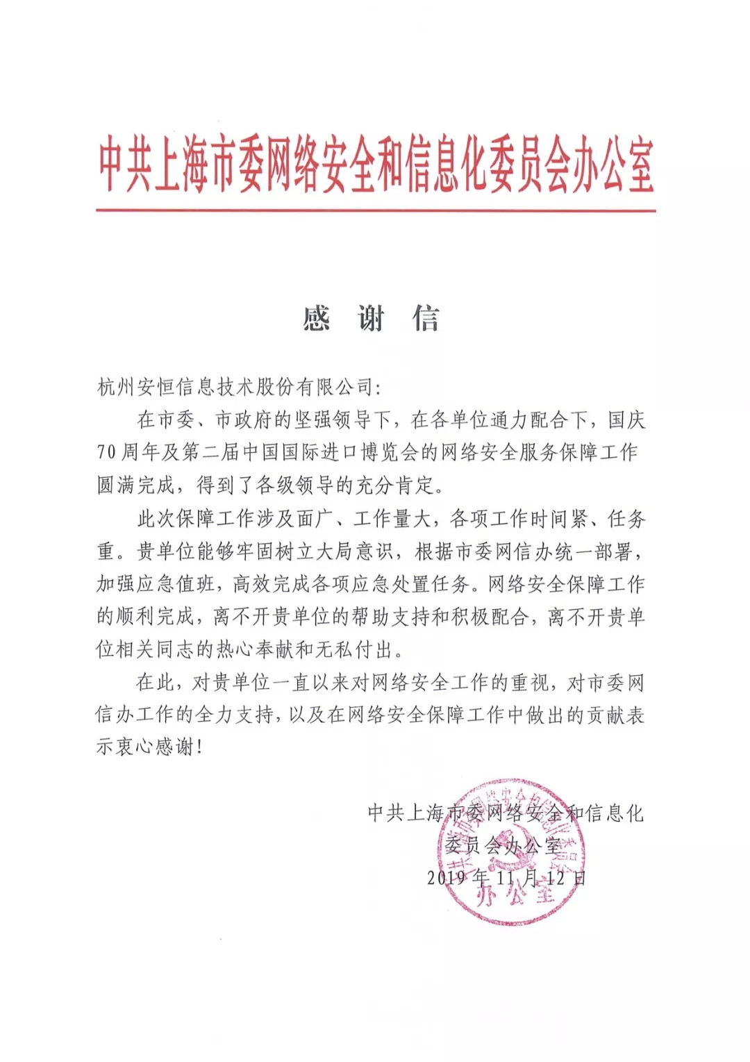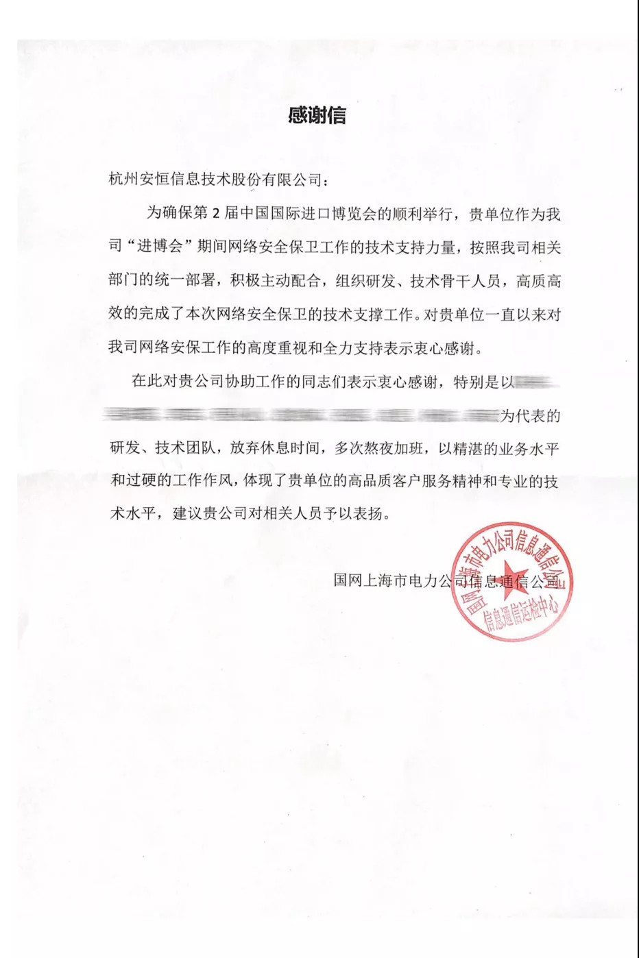 近日,人生就是搏z6尊龙收到这些感谢信,它们来自”中国国际进口博览局、中共上海市委网络安全和信息化委员会办公室、上海市公安局智慧公安建设领导小组办公室、浦东分局网络安全保卫支队、闵行区进博会网络安全工作组、国家会展中心(上海)、国网上海市电力公司信息通信公司......“