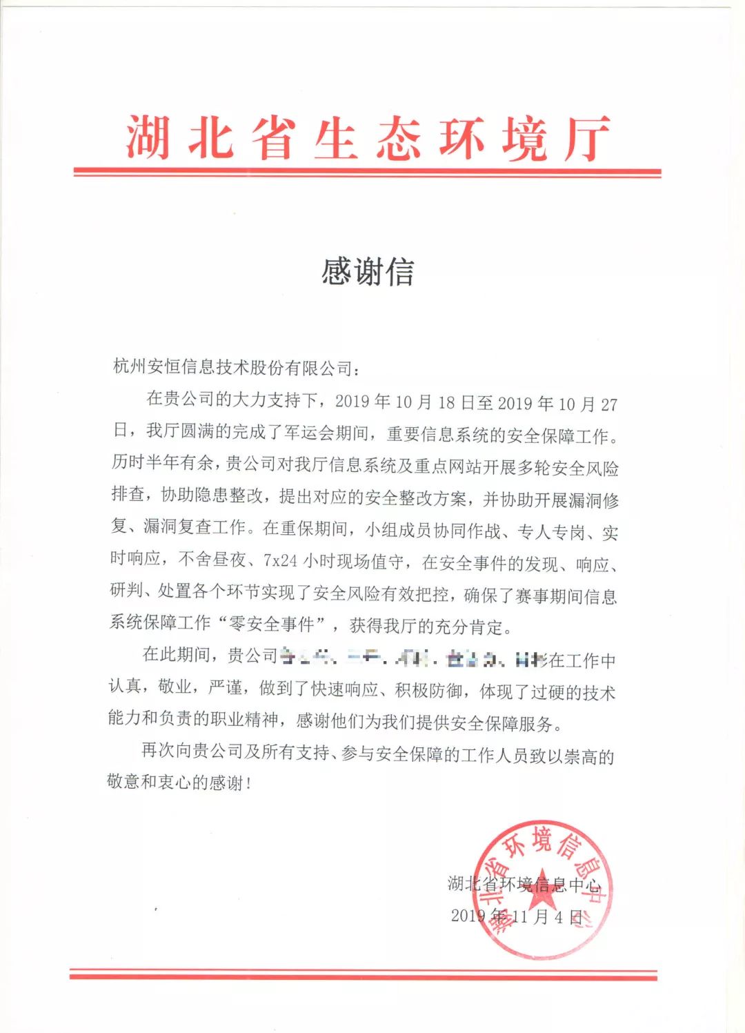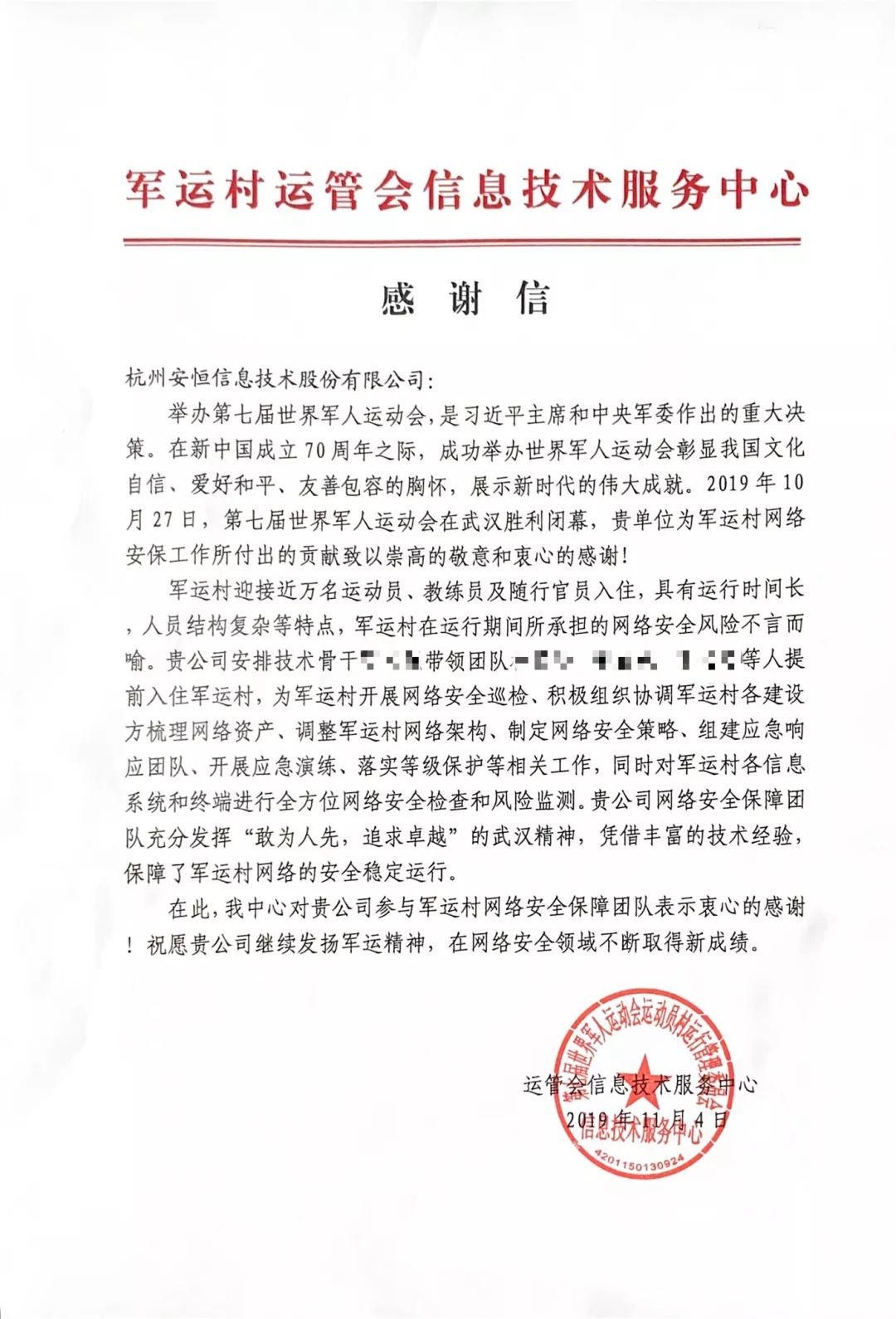 在贵公司的大力支持下,我厅圆满完成了军运会期间,重要信息系统的安全保障工作。历时半年有余,贵公司对我厅信息系统及重点网站开展多轮安全风险排查,协助隐患整改,提出相应的安全整改方案,并协助开展漏洞修复、漏洞复查工作。在重保期间,小组成员协同作战、专人专岗、实时响应、不舍昼夜,7x24小时现场值守,在安全事件的发现、响应、研判、处置各个环节实现了安全风险有效把控,确保了赛事期间信息系统保障工作“零安全事件”,获得我厅的充分肯定。