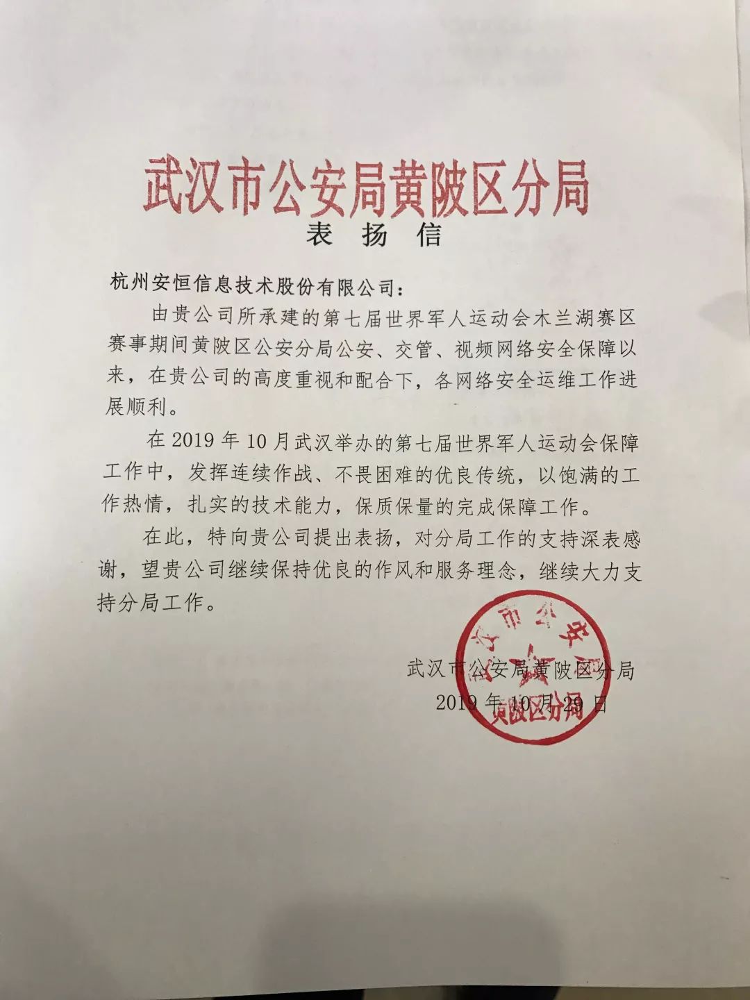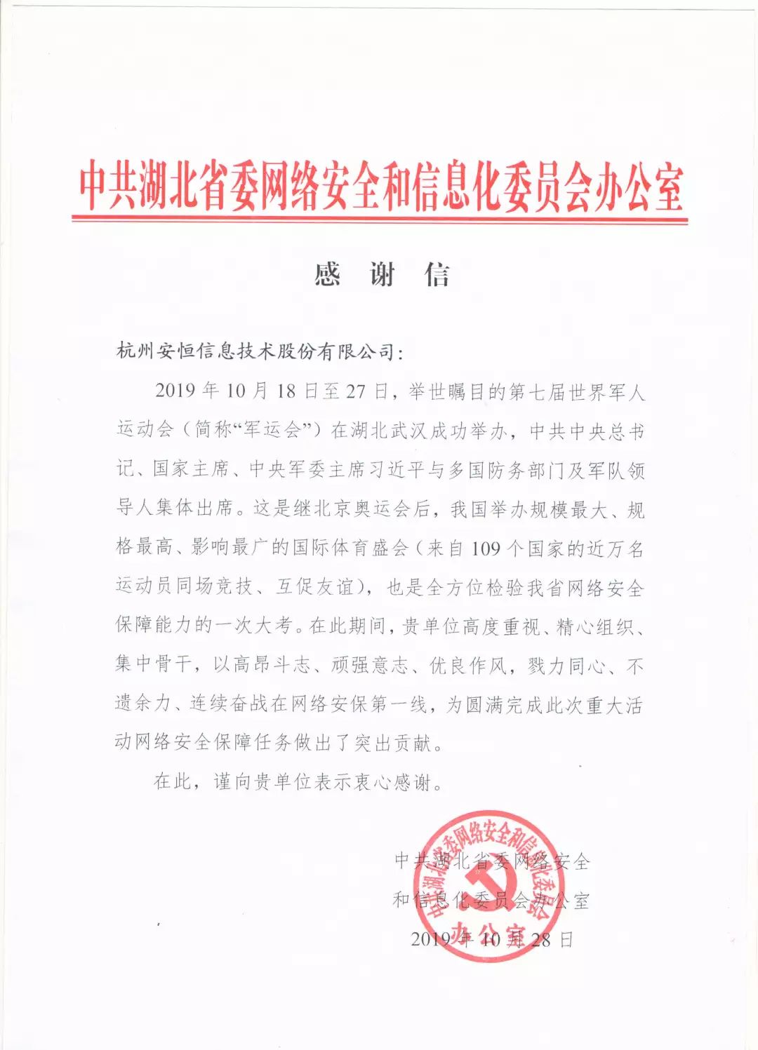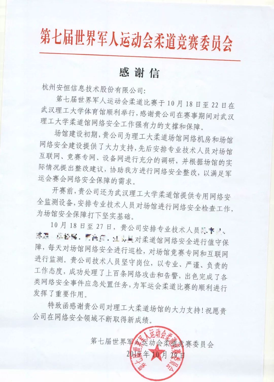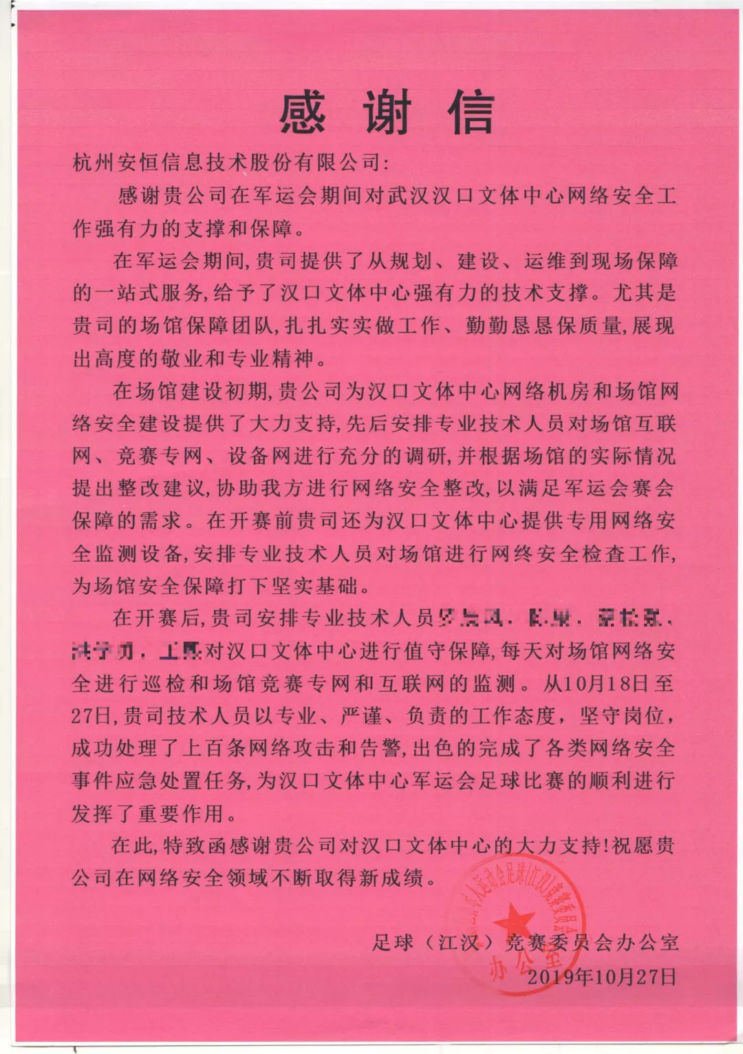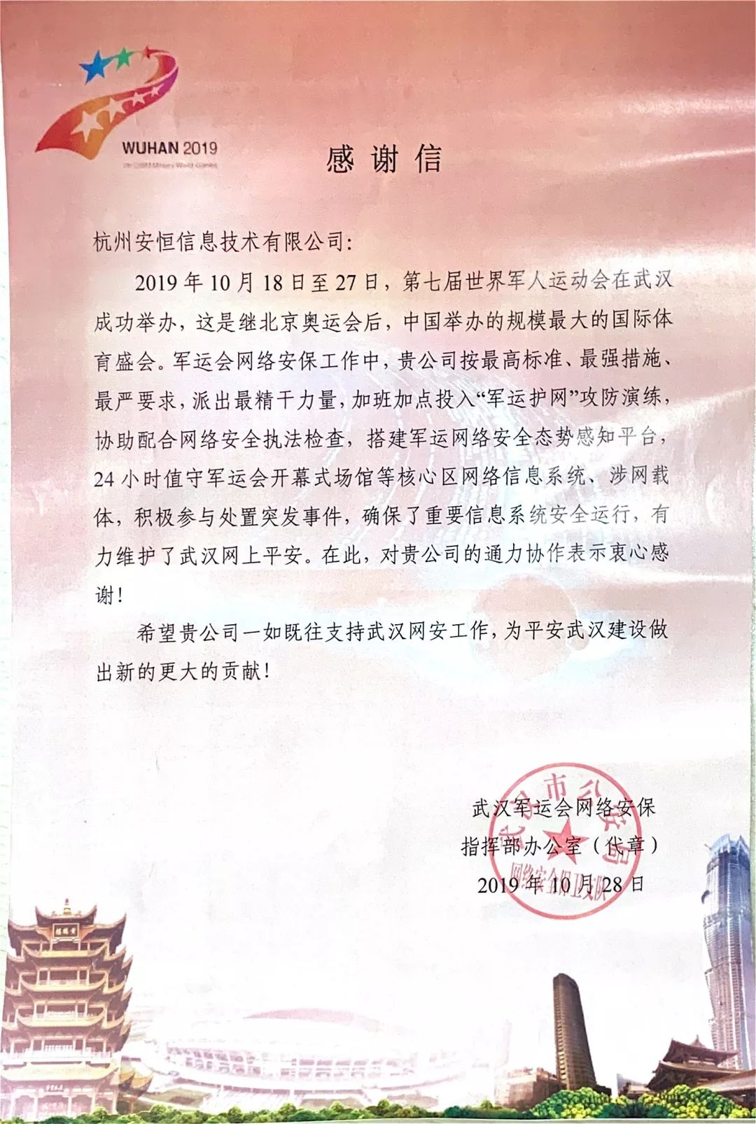 近日,安恒信息收到了来自第七届世界军人运动会(以下简称“武汉军运会”)执行委员会、湖北省委网信办、武汉市公安局、湖北省生态环境厅等诸多的感谢信,充分肯定了安恒信息在武汉军运会中高质、高效地完成网络安保任务。