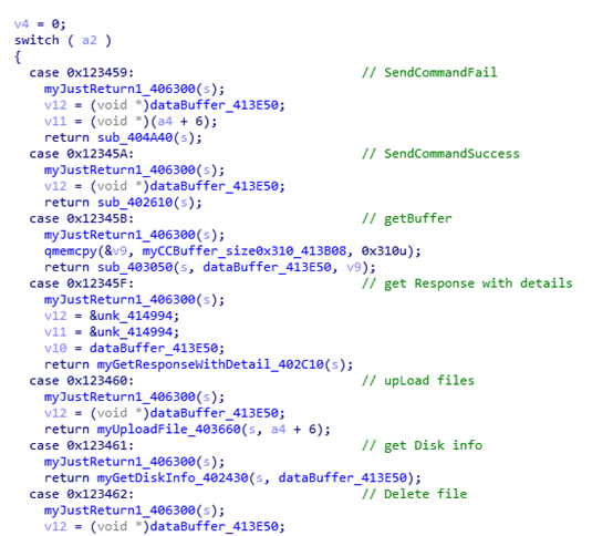 C2指令中包含非常多的基础功能,包括文件获取、磁盘遍历、写文件、重启删除、进程创建、CMD命令执行等,通过组合方式构造成高级指令执行。