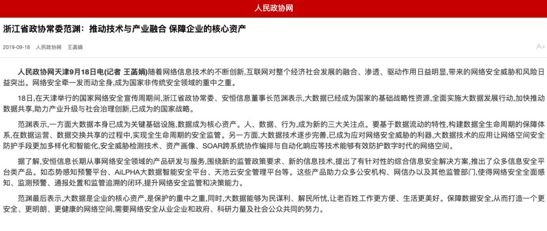 在天津举行的国家网络安全宣传周期间,浙江省政协常委、安恒信息董事长范渊表示,大数据已经成为国家的基础战略性资源,全面实施大数据发展行动,加快推动数据共享,助力产业升级与社会治理创新,已成为的国家战略。