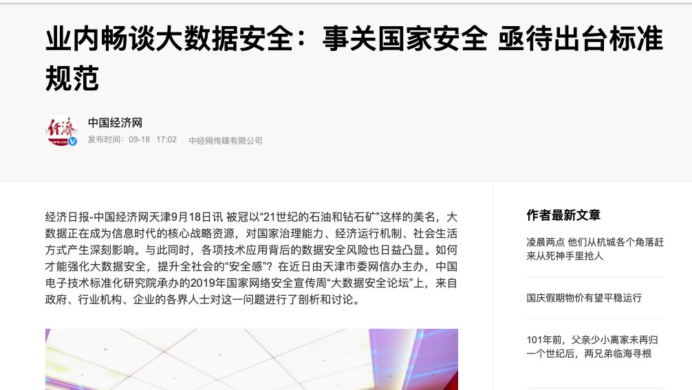 作为安全周重要的分论坛之一,9月17日举行的“大数据安全论坛”邀请了党政机关领导、国内知名专家学者、各省市大数据局代表等,对话“新时代下大数据安全新态势”。人民网、中国经济网、中国青年报、法制网等纷纷做了报道。
