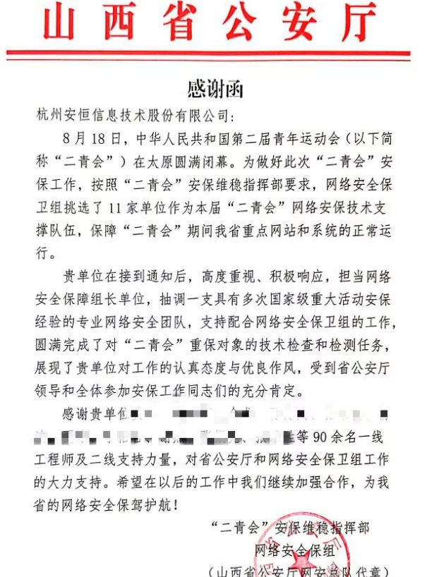 8月8日,第二届全国青年运动会在山西举办。安恒信息作为“二青会”网络安全保障组长单位,在山西省公安厅的统筹下,全方位保障“二青会”期间网络安全,累计组织90余名网络安全专家,全程参与安保工作方案制定、安全检查、渗透测试、值守驻点、应急处置等工作,高效高质地完成了安保任务,得到了各级单位的认可,收获感谢信。