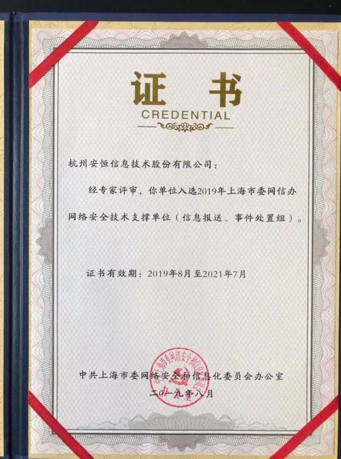 8月,上海市委网信办公布2019年上海市委网信办网络安全技术支撑单位名单,安恒信息成功入选,成为首批网络安全技术支撑单位。