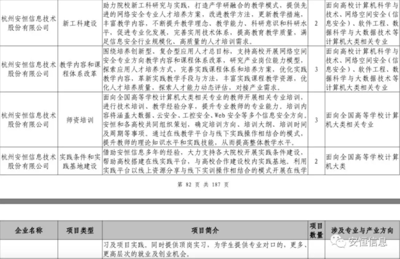 8月12日,教育部公布了有关企业支持的产学合作协同育人项目申报指南(2019年第一批)的通知,本批次申报指南中,共有324家企业支持项目10647项。安恒信息成功申报教育部2019年第一批产学合作协同育人项目。