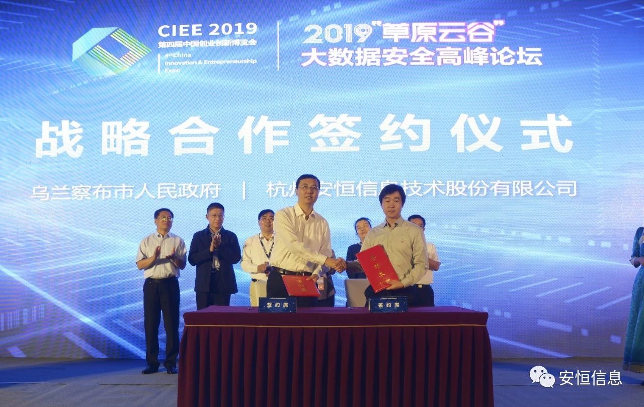 在2019草原云谷大数据安全高峰论坛中,乌兰察布市人民政府与人生就是搏z6尊龙信息技术股份有限公司签订战略合作协议。