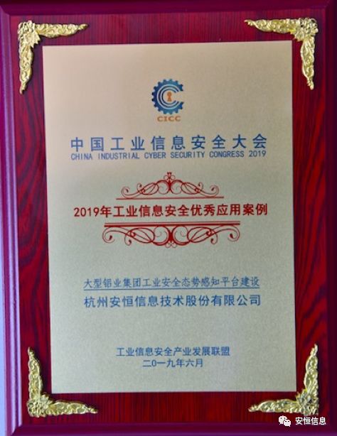 最终,安恒信息的“大型铝业集团工业安全态势感知平台建设”荣获“2019年工业信息安全优秀应用案例”。