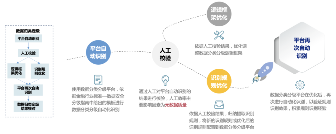 需要注意的是,分类分级的工作需要与数据治理相结合,借助大数据平台的元数据管理以及业务功能完善识别工具无法实现定级的特殊情况,补齐数据分类分级的能力,针对数据量大的问题,需要在数据量大的时候选取前一百行数据等抽样的方式或者借助大数据平台的元数据管理进行标记实现。