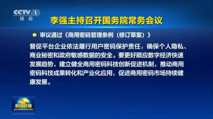 2023年4月14日,国务院常务会议审议通过《商用密码管理条例(修订草案)》,凸显促进商用密码应用与保障安全相统一的价值导向,其中对商用密码的管理、认证和检测等方面都进行了较为具体的规定,更加突出了促进商用密码发展的立法原意。