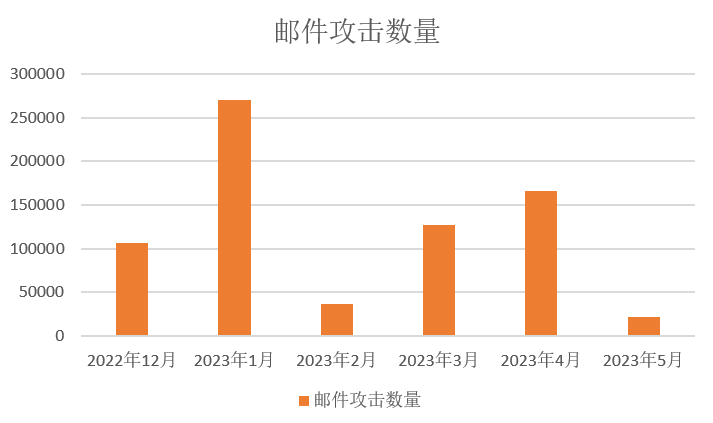 2022年12月至2023年5月期间,安恒信息云监测平台监测到邮件攻击超60万次,这部分的攻击是绕过了邮件安全网关并最终到达用户邮件文件夹的邮件数量,即最终受影响的数量。