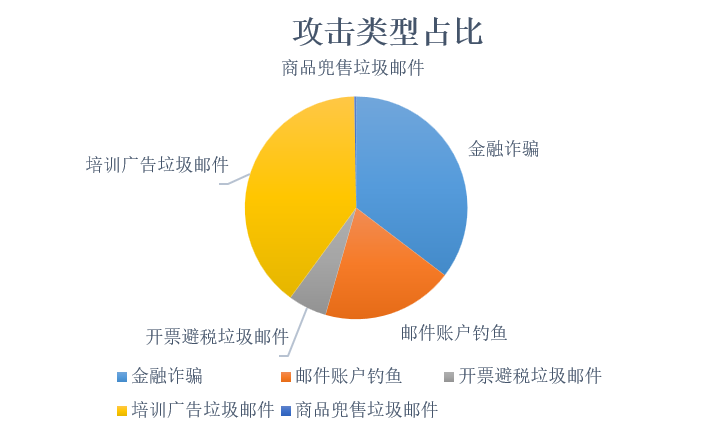 从恶意邮件类型分析,培训类广告投递和金融诈骗为主,分别占比39%和35%,其次是盗号钓鱼类,占比19%,所以可以得出结论,恶意邮件攻击以牟利为主要目的,如图4所示。