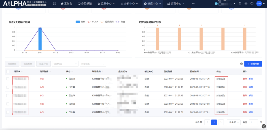 因此经客户同意后,第一时间在AiLPHA平台联动K01防火墙封堵了攻击IP。