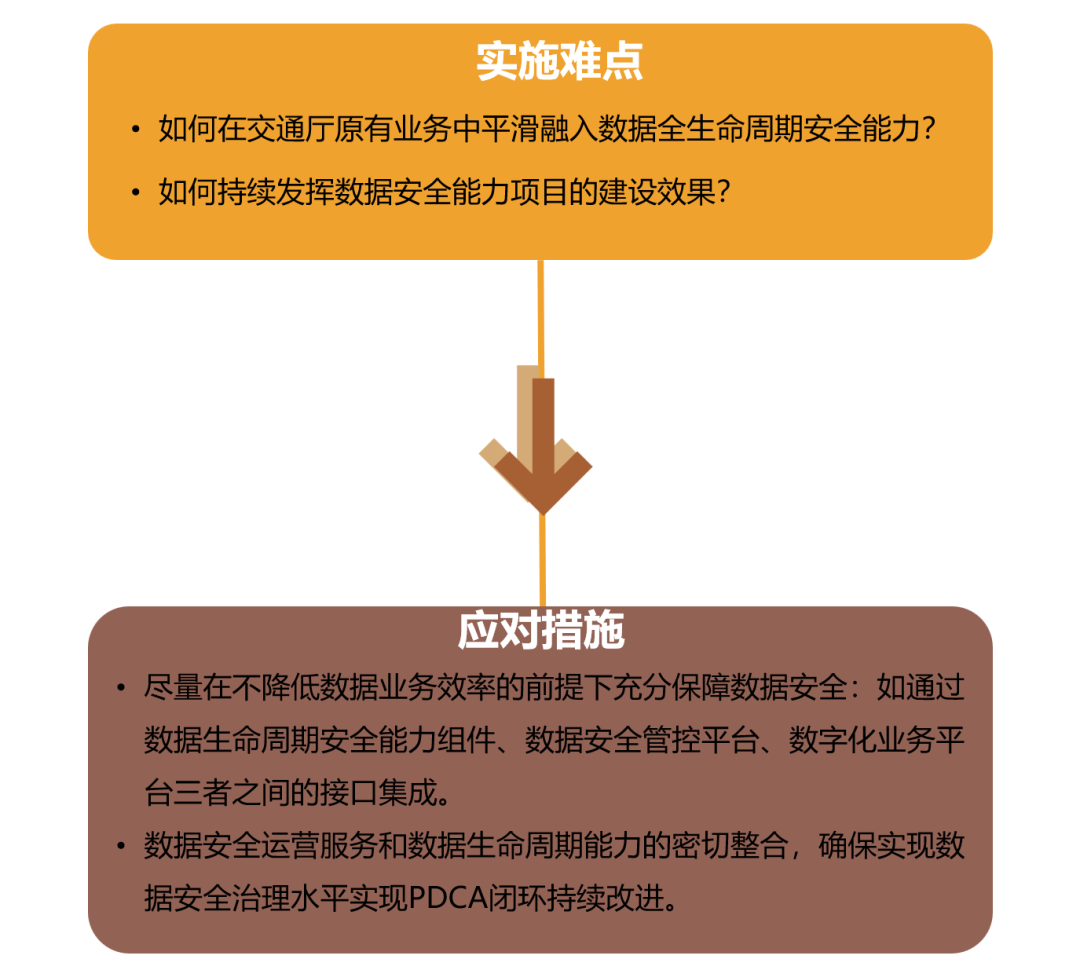 交通厅数据类型多样,同时还需要满足政府监管部门、企业客户和个人用户等不同利益相关者的安全需求,那么如何持续发挥数据安全能力项目的建设效果,开展持续性优化运行和经营的数据安全运营服务是持续数据安全建设的挑战。