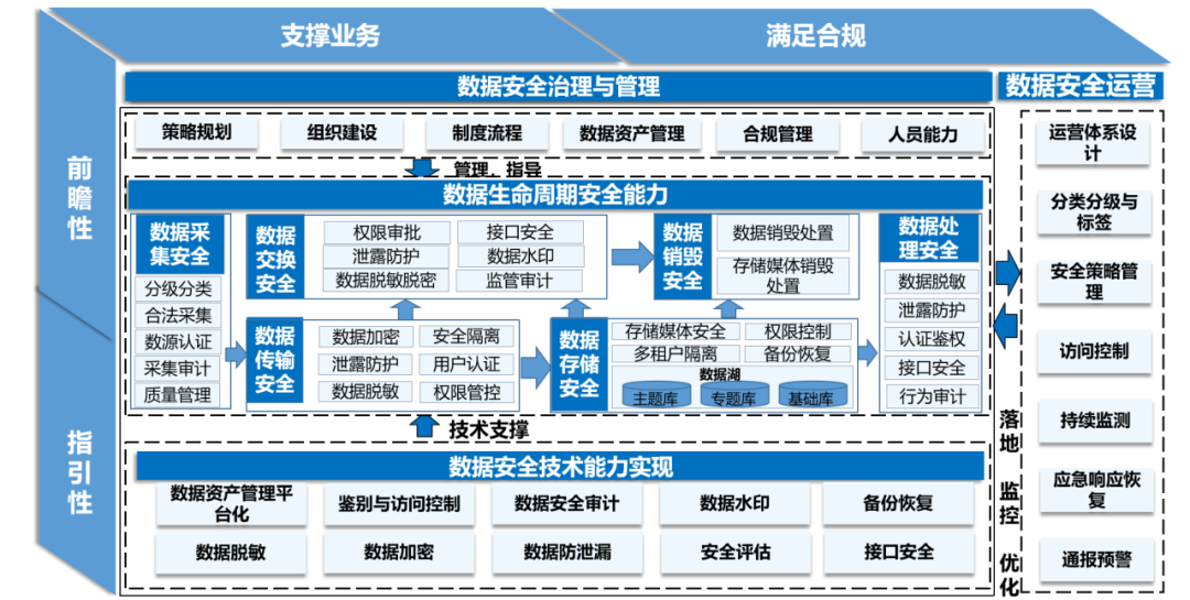 为了保障数字化业务平台务顺利安全运行,满足合规监管要求,充分考虑交通厅发展的前瞻性和指引性,基于数据安全成熟度模型对交通厅现有数据安全成熟度水平进行评估并从数据安全管理、技术、运营能力建设三方面制定建设目标愿景。通过对交通厅的数据安全措施采用结构化的差距评估分析方法进行评估,识别存在的安全风险和薄弱环节,确定对标基线和目标,构建数据安全能力框架和数据安全运营框架: