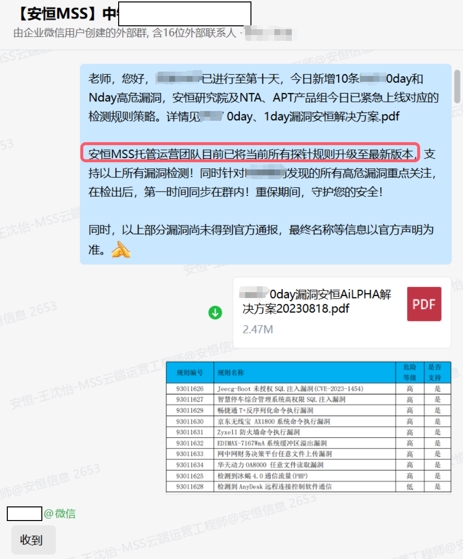 针对演习托管场景用户,MSS远程服务专家认为推送情报只是基础,真正要做的是申请设备操作授权,直接帮助用户升级探针、防火墙、APT等设备规则,缩短安全检测真空期,让用户在这紧张的演习期间能够获得“安全感”。