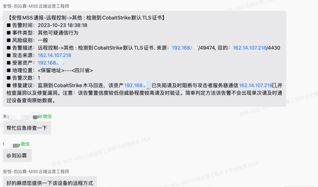 10月的某天凌晨,云端安全分析人员发现该供应商某管理系统出现异常告警:CS特征流量告警,通过对告警详情分析,确认机器失陷。值班人员立即电话联系用户对接人,在说明情况并得到用户确认后,断网处理的同时对CS外连IP进行封堵。