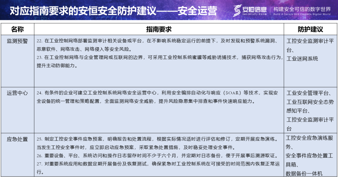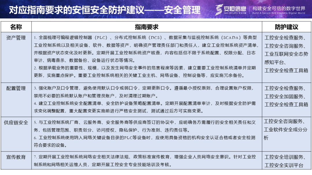 安恒信息深耕工业信息安全领域数年,面向使用、运营工业控制系统的企业提供贯穿IT/OT的融合性工业信息安全解决方案,覆盖工业企业在数字化转型过程中的架构与边界安全、上云安全、应用安全、工业数据安全、主机与终端安全等不同安全场景,协助工业企业用户做好工业控制系统网络安全面临的突出问题,安恒信息通过多年技术沉淀,形成符合《工业控制系统网络安全防护指南》要求的安全防护体系,协助工业企业进行安全建设。